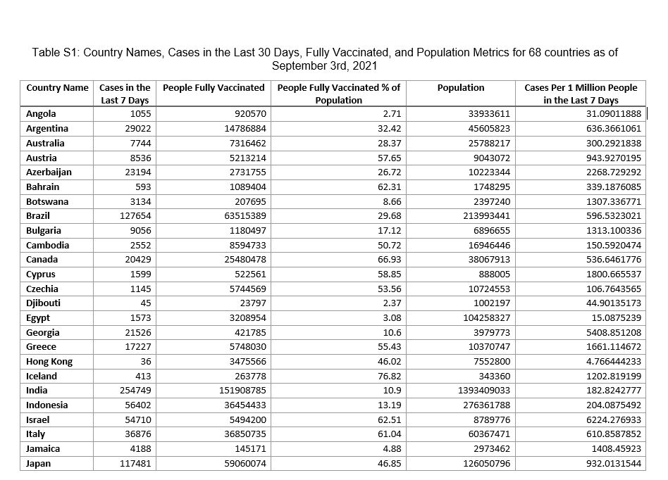 Les pays inclus devaient remplir les critères suivants : "données disponibles sur la deuxième dose, données disponibles sur les cas de Covid, données de populations disponibles et les données devaient avoir été mises à jour au maximum 3 jours avant le 3 septembre". La liste figure dans cette annexe (voir captures d'écran plus bas).