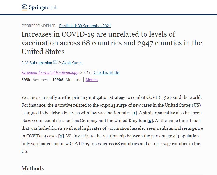 L'idée est "d'examiner le lien entre le pourcentage de population entièrement vaccinée et les nouveaux cas de Covid-19 dans 68 pays d'une part et 2.947 comtés aux Etats-Unis d'autre part", peut-on lire au début de l'article.