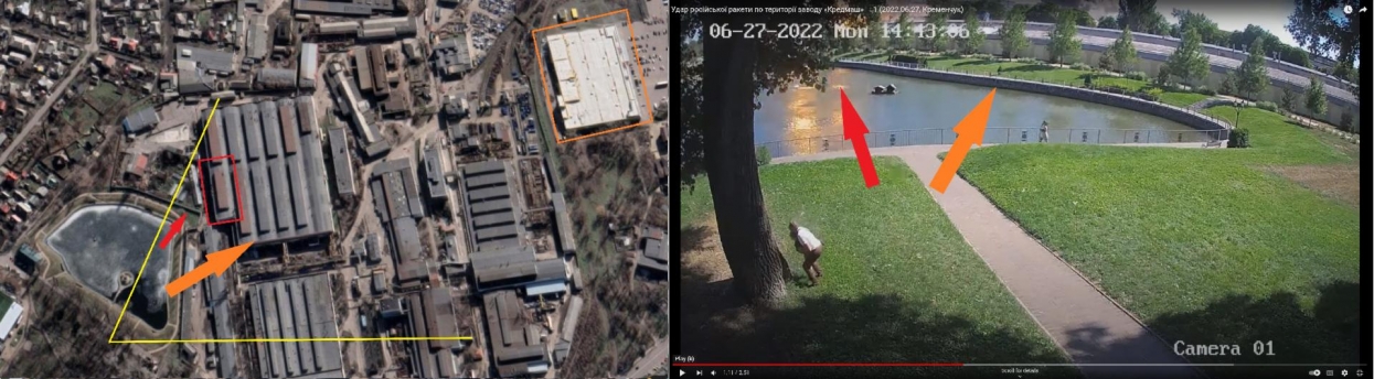 Des images d'une caméra de surveillance d'un site industriel au nord du centre commercial, publiées sur Twitter par un conseiller du président ukrainien, montrent le moment où l'un des deux missiles a frappé. L'AFP, à l'instar du média d'investigation Bellingcat, a pu situer l'emplacement de la caméra à partir d'images satellites. Bien que le lieu exact de l'impact ne puisse pas être déterminé à partir de ces images, la direction du missile montre que celui-ci ne semble pas se diriger vers la gare ou le site industriel. Dans son enquête, Bellingcat relève que les environs de la gare ne semblent pas avoir subi de dommages visibles.