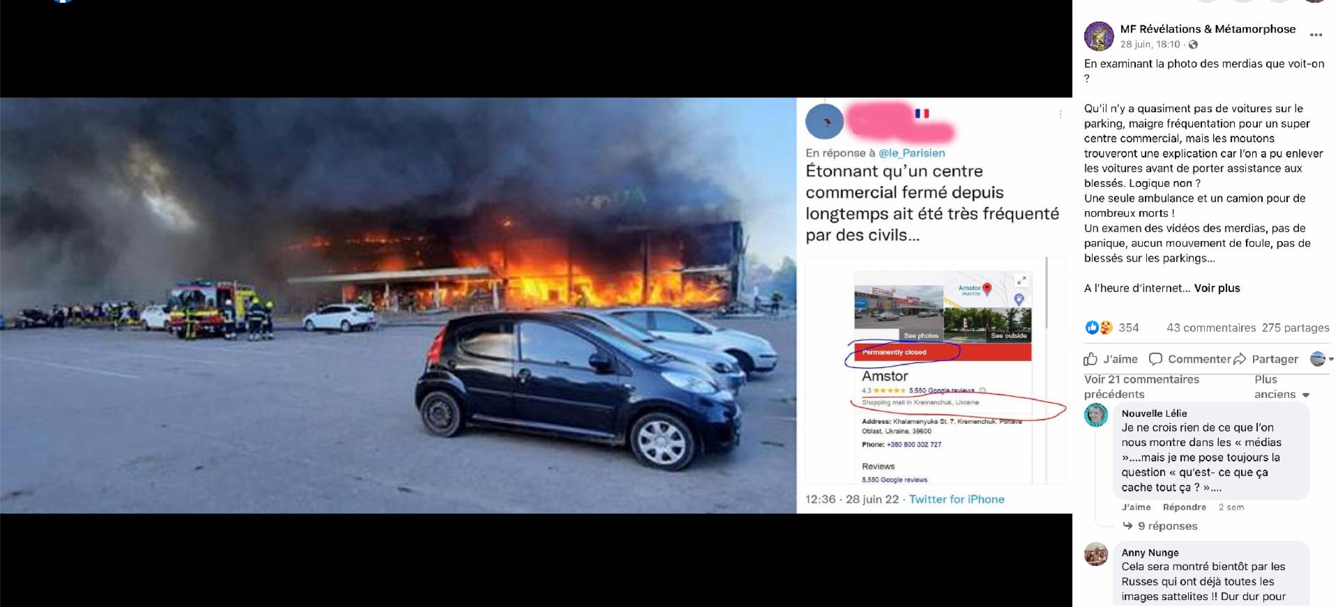 Sur les réseaux sociaux, des internautes ont également affirmé que le centre commercial de la ville était vide au moment des frappes, en s'appuyant sur une capture d'écran de Google Maps. Celle-ci montre une fiche d'informations sur le centre commercial Amstor. Il est indiqué comme étant "fermé", ce qui les conduit à remettre en question la version ukrainienne des faits : "étonnant qu'un centre commercial fermé depuis longtemps ait été fréquenté par des civils", "quel foutage de gueule", s'insurge l'un d'entre eux, "c'est le royaume du mensonge", renchérit un autre. Des affirmations similaires ont également circulé en anglais, en allemand ou encore en finnois.
