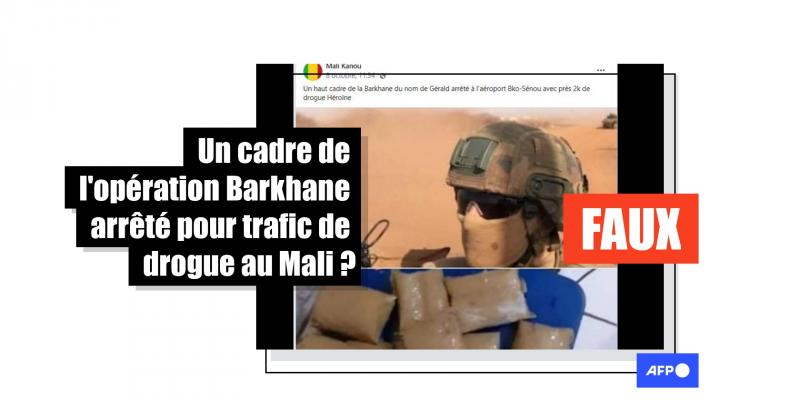 Une publication totalisant près de 1.000 partages sur Facebook depuis le 8 octobre 2021 prétend qu’un "haut cadre" de l’opération Barkhane, force militaire française contre le terrorisme au Sahel, a été interpellé à l’aéroport de Bamako, au Mali, en possession de deux kilogrammes d’héroïne. C'est faux, ont dit à l'AFP l'Office malien des stupéfiants et l'Etat-major français.