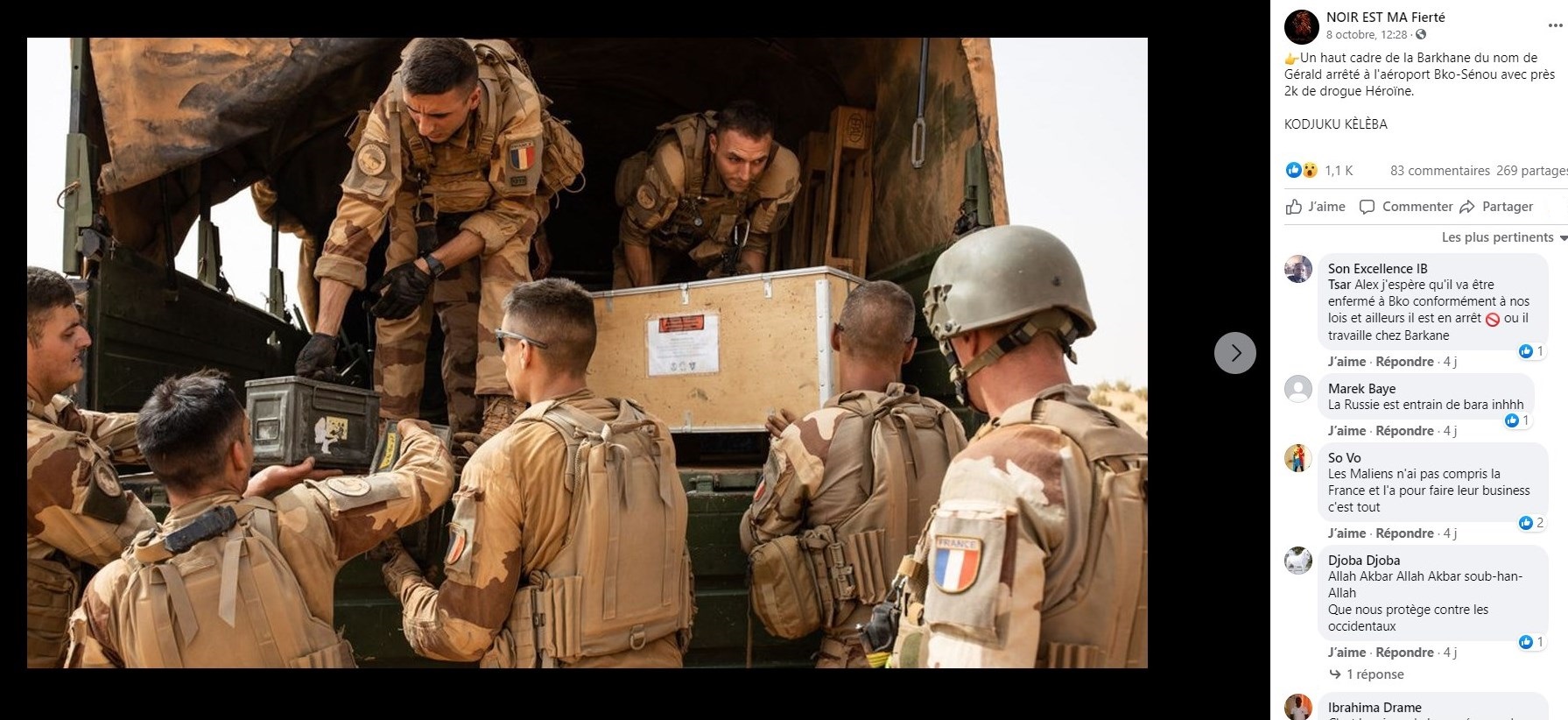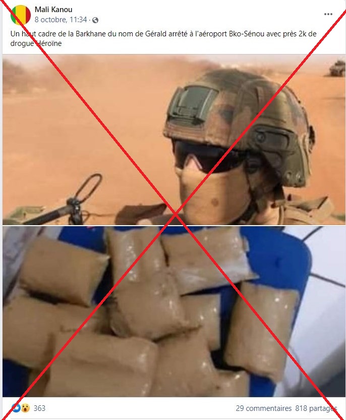 "Un haut cadre de la Barkhane du nom de Gérald arrêté à l'aéroport Bko-Sénou avec près 2k de drogue Héroïne", affirme l’auteur d’un post Facebook publié le 8 octobre. Le même message est repris par plusieurs publications (1, 2, 3), certaines avec une illustration différente de celle du post viral.