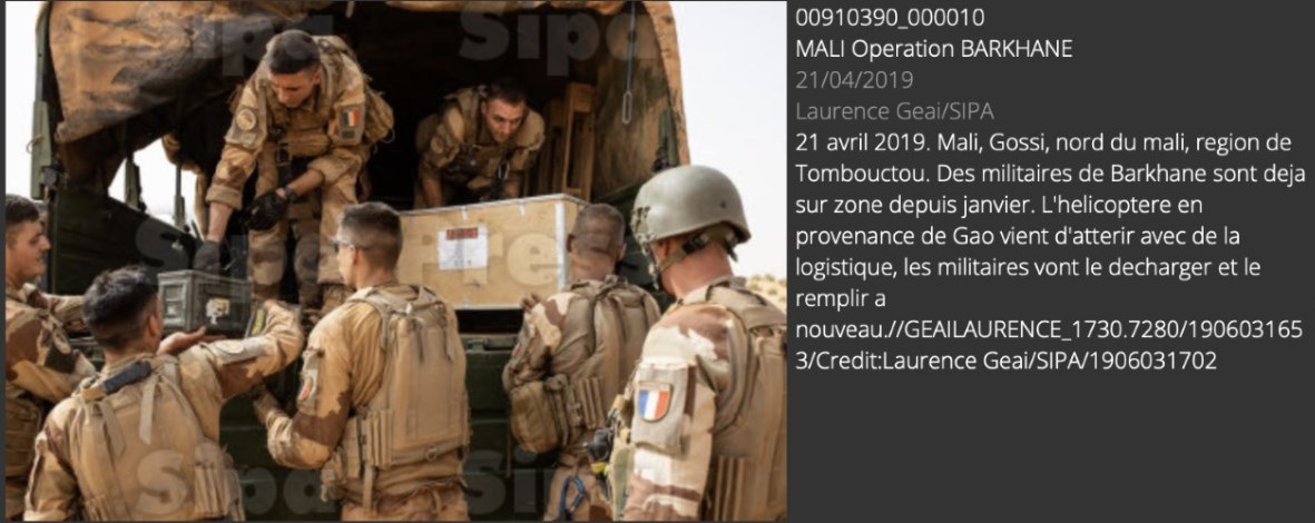Les résultats d’une recherche d’images inversée avec le moteur de recherche Google images aboutissent à plusieurs publications illustrées avec cette photo, dont un article du quotidien régional français, Ouest France. Dans ce reportage publié le 31 mai 2019 sur l'opération Barkhane au Mali, cette photo est créditée “Ouest France”. L’auteur de ce reportage de terrain est Paul Simon.