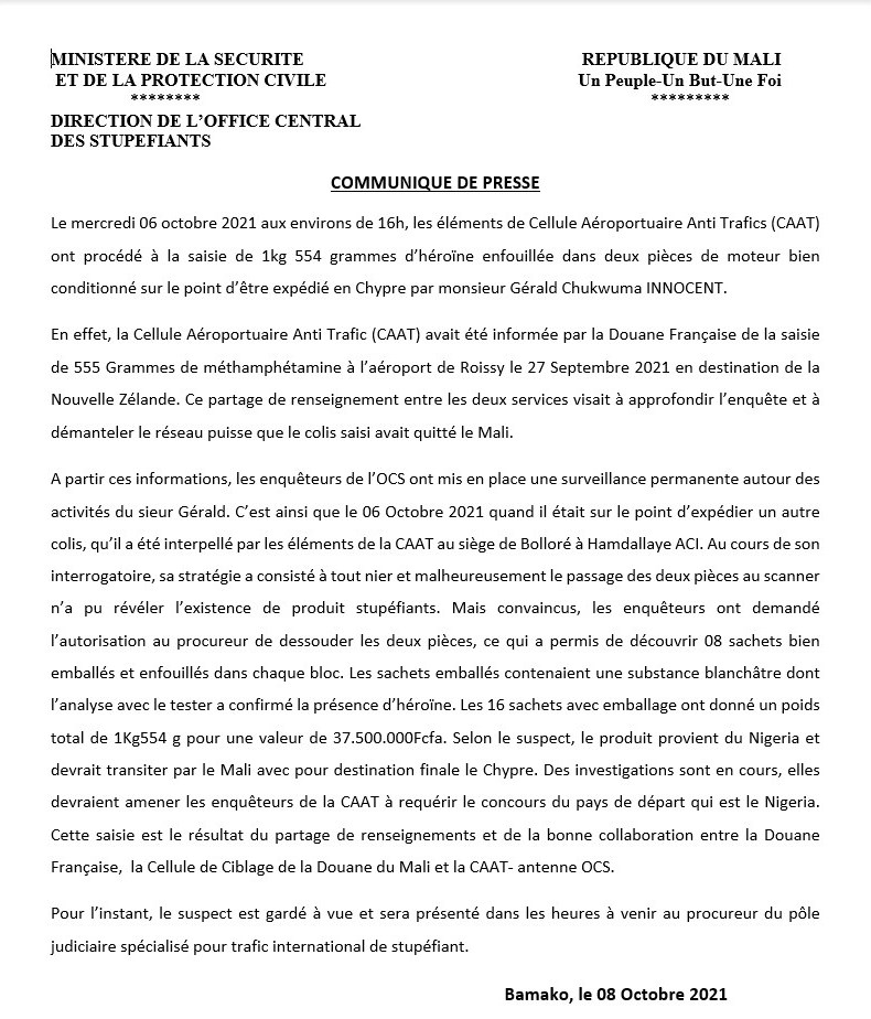 Ce communiqué de la direction de l’Office malien des stupéfiants porte sur une opération de saisie de 1 kg 554 grammes d'héroïne sur un certain Gérald Chukwuma Innocent, le 6 octobre 2021 au Mali. L'opération a été menée par les éléments de la Cellule aéroportuaire anti trafics (CAAT) qui dépend de l'Office des Nations unies contre la drogue et le crime.