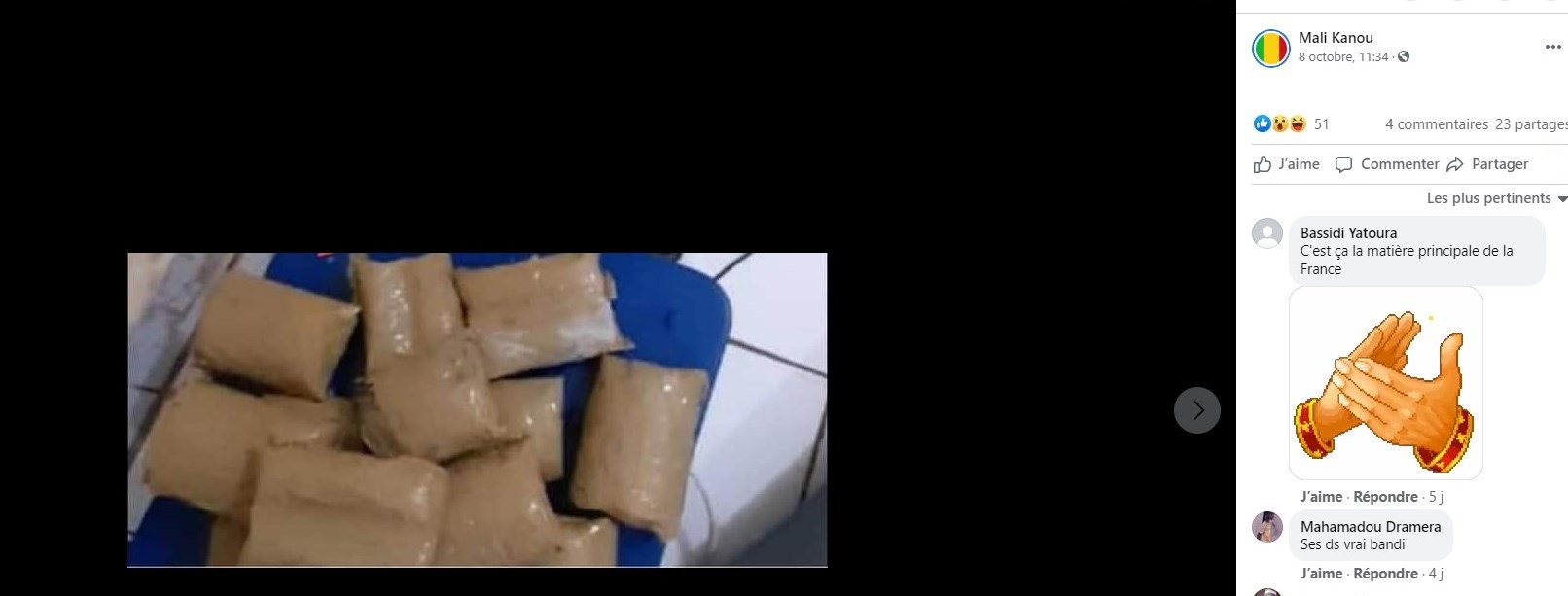 Cette troisième image, montrant une dizaine de sachets au contenu marron,apparaît sur Internet dès le 8 octobre 2021, à la suite du communiqué de l’Office central des stupéfiants sur son opération de saisie de 16 sachets de cocaïne. Ce cliché est notamment utilisé par des sites d’information en ligne maliens (1,2,3).