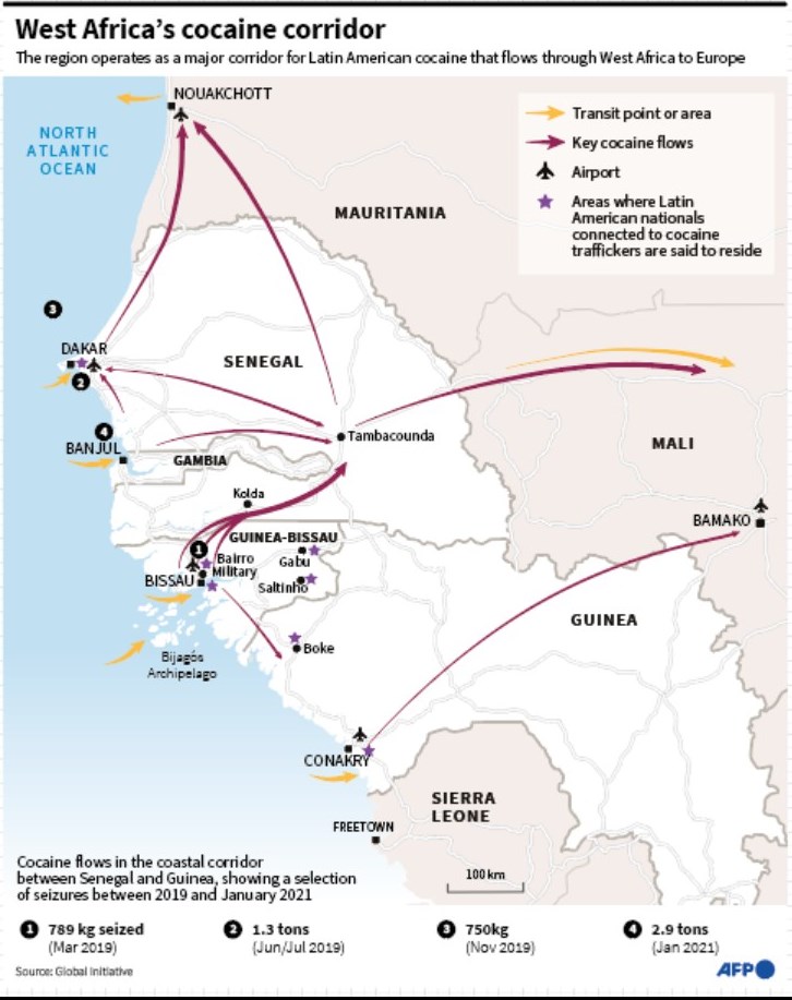 Selon un rapport de l'Initiative mondiale contre la criminalité transnationale organisée, publié en avril 2021, l'Afrique de l'Ouest (en particulier la Guinée-Bissau) a longtemps fait figure de plaque tournante du trafic de drogue, notamment de cocaïne entre les Amériques et l'Europe. La région est le principal corridor de la cocaïne en provenance de l'Amérique latine qui alimente l’Afrique de l’Ouest et l’Europe.