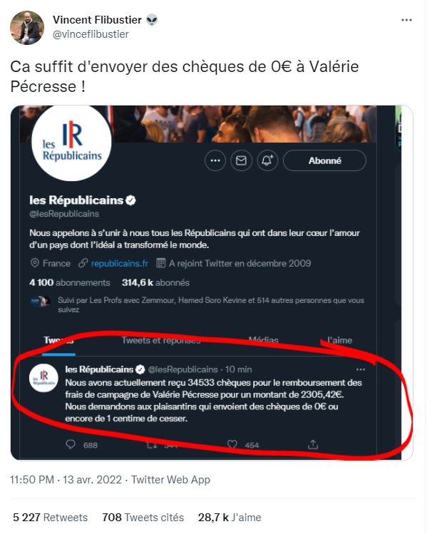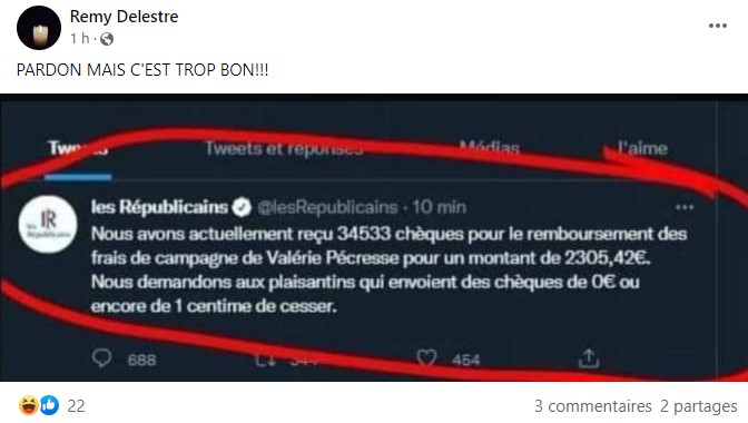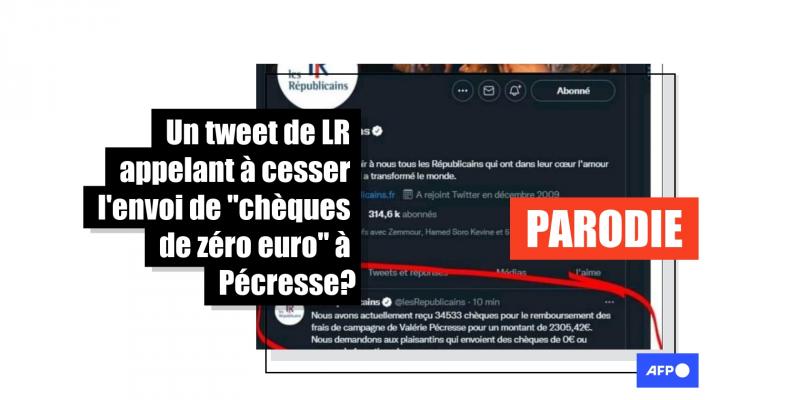 Une capture d'écran relayée sur Twitter et sur Facebook prétend montrer un tweet des Républicains publié après la défaite de Valérie Pécresse à la présidentielle. "Nous demandons aux plaisantins qui envoient des chèques de 0 euro ou encore de 1 centime de cesser", y affirmerait le parti dont la candidate a lancé un appel aux dons pour "boucler" le financement de sa campagne. Mais il s'agit d'un "montage grossier", comme l'indiquent Les Républicains à l'AFP. Ce faux tweet humoristique a été réalisé par le site parodique Nordpresse en réaction aux déboires financiers de Valérie Pécresse, dont le score inférieur à 5% l'empêche d'obtenir le remboursement par l'Etat de ses frais de campagne.