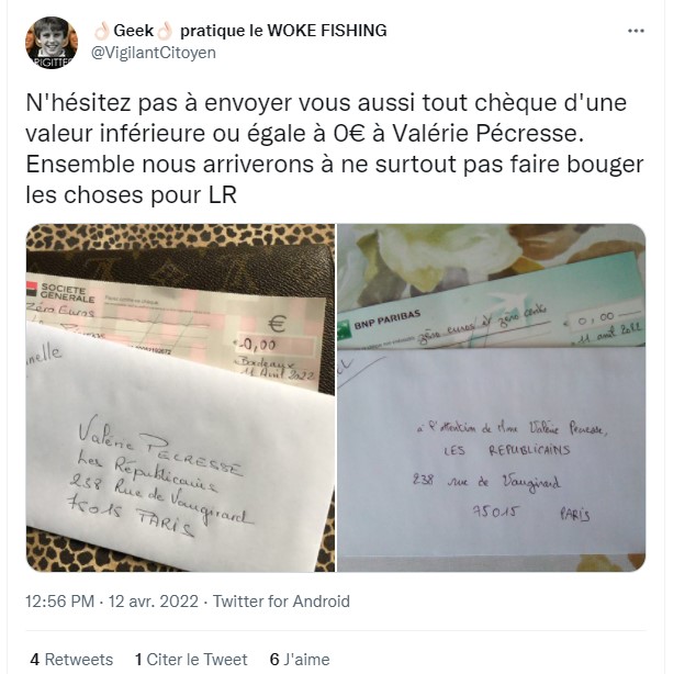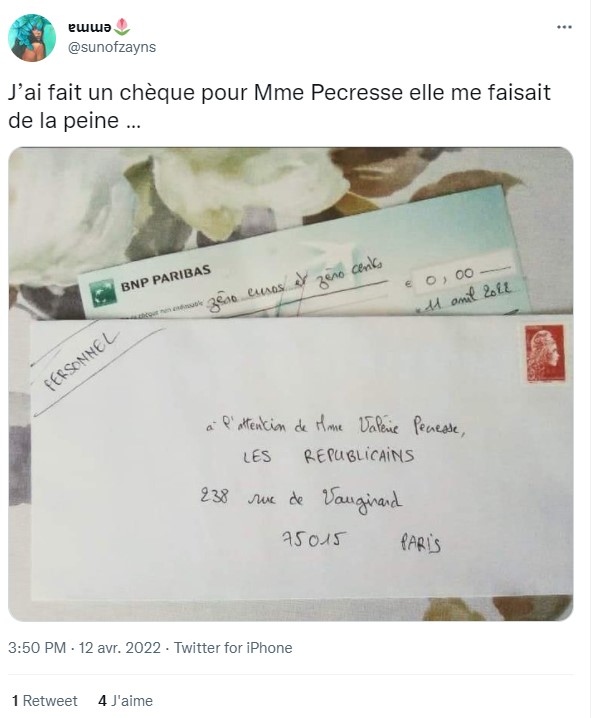 En l'occurrence, les internautes ont fait le lien avec des photos publiées par différents utilisateurs de Twitter ces derniers jours, montrant des courriers libellés à l'adresse du parti des Républicains et censés contenir des chèques de "zéro euro" ou "zéro euro et zéro cents" au nom de Valérie Pécresse.