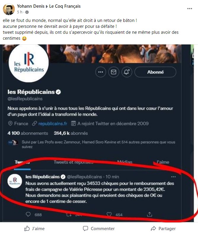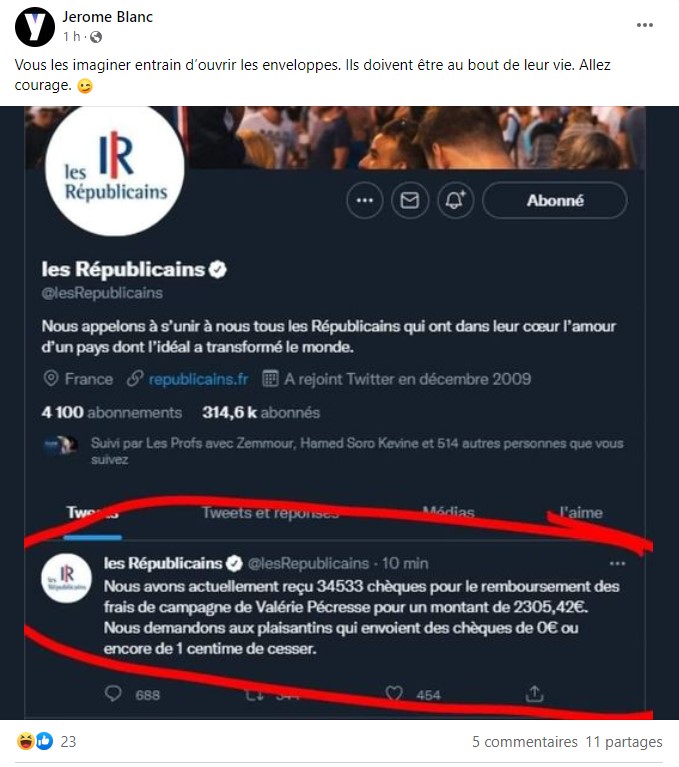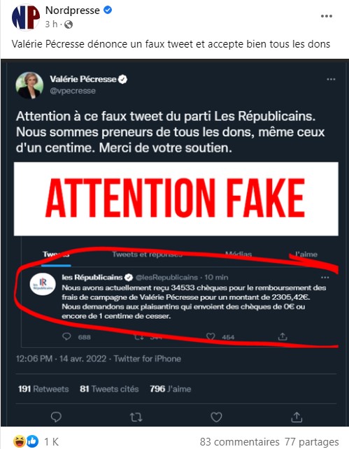 Avant d'en rajouter une couche le 14 avril sur Facebook en publiant un deuxième montage : un faux tweet de Valérie Pécresse réagissant au premier montage pour dénoncer un "faux tweet"... tout en reconnaissant accepter "tous les dons, même ceux d'un centime".