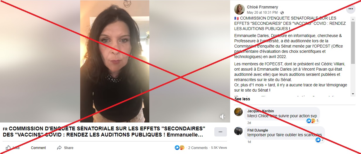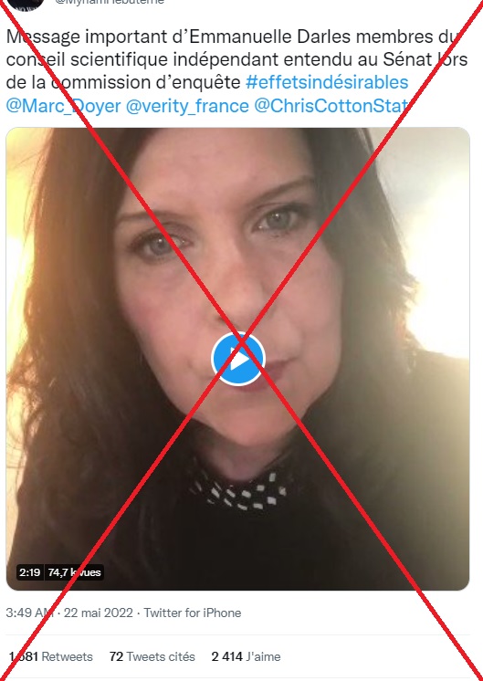 "Message important d'Emmanuelle Darles, membre du conseil scientifique indépendant entendu au Sénat lors de la commission d'enquête #effetsindésirables", indique la description d'un tweet partagé plus de 1.600 fois depuis le 22 mai, relayant une vidéo dans laquelle une femme s'exprime, face à la caméra.