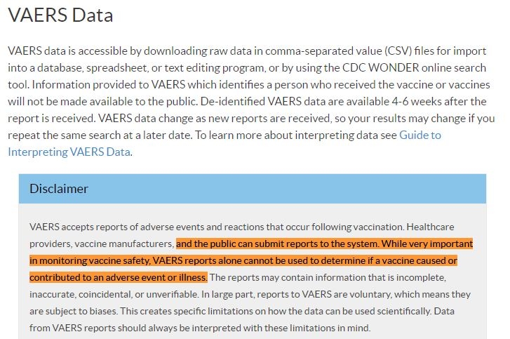 Les Centres pour le contrôle et la prévention des maladies (CDC), qui forment la principale agence fédérale des États-Unis en matière de protection de la santé publique, expliquent que "les fournisseurs de vaccins sont encouragés à signaler tout problème de santé cliniquement significatif survenu après une vaccination, qu'ils pensent ou non que le vaccin en est la cause".