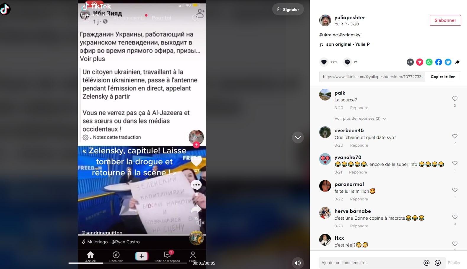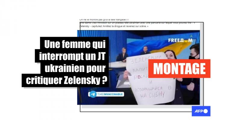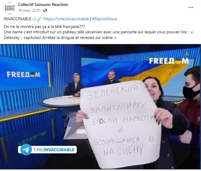 Dans la vidéo qui accompagne toutes ces publications, on voit une femme avec une pancarte surgissant sur un plateau de télévision aux couleurs de l'Ukraine. "Zelensky, capitule, arrête les drogues et retourne à la scène", peut-on lire sur l'affiche, en référence au passé d'acteur de l'actuel président ukrainien.