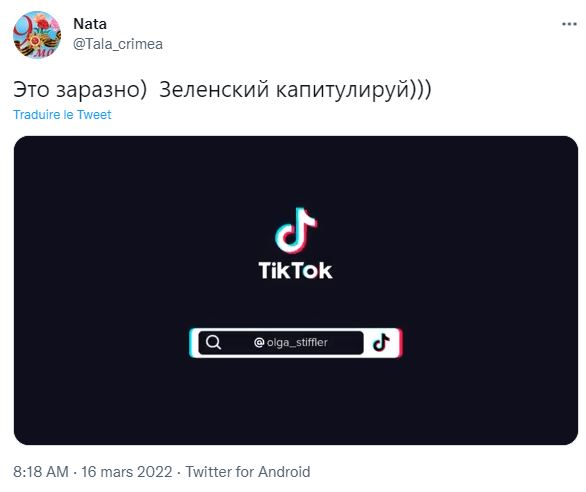 Les extraits vidéos les plus anciens retrouvés par l'AFP - datés du 15 mars - s'achèvent sur un écran accompagné du logo du réseau social TikTok et mentionnent le nom d'une utilisatrice : Olga Stiffler.