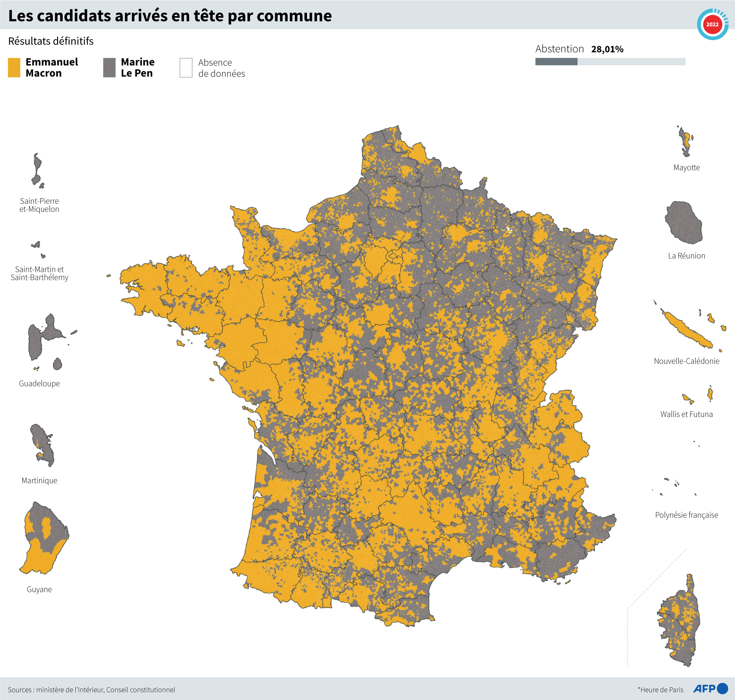 Les résultats définitifs de l'élection présidentielle ont été entérinés le 27 avril par le Conseil constitutionnel, qui a proclamé Emmanuel Macron président pour avoir recueilli la majorité absolue des suffrages (58,55%) face à Marine Le Pen, lors du second tour de l'élection.