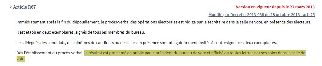 L'article R67 du Code électoral cité dans le tweet dispose qu'"immédiatement après la fin du dépouillement, le procès-verbal des opérations électorales est rédigé par le secrétaire dans la salle de vote, en présence des électeurs" et "le résultat est proclamé en public par le président du bureau de vote et affiché en toutes lettres par ses soins dans la salle de vote".