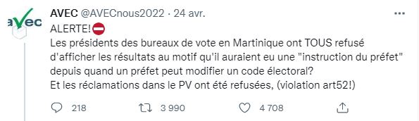 "ALERTE ! Les présidents des bureaux de vote en Martinique ont TOUS refusé d'afficher les résultats au motif qu'il auraient eu une 'instruction du préfet', depuis quand un préfet peut modifier un code électoral?", s'alarme le compte "Avecnous2022" dans un tweet partagé 3.700 fois en 24 heures.