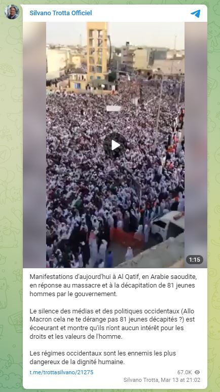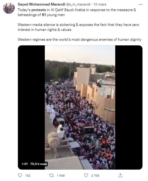 "Manifestations d'aujourd'hui à Al-Qatif, en Arabie saoudite, en réponse au massacre et à la décapitation de 81 jeunes hommes par le gouvernement. Le silence des médias et des politiques occidentaux (Allo les médias français le gouvernement pas de respect pour 81 jeunes décapités ?) est écœurant et montre qu'ils n'ont aucun intérêt pour les droits et les valeurs de l'homme", écrivent des internautes indignés dans la légende qui accompagne ces images.