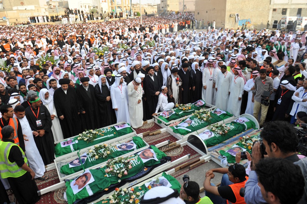 La légende indique que "des Saoudiens en deuil assistaient, le 7 novembre 2014, aux funérailles de huit victimes chiites tuées en début de semaine par des hommes armés masqués dans la ville d'Al-Dalwa, dans la province orientale de l'Arabie saoudite".