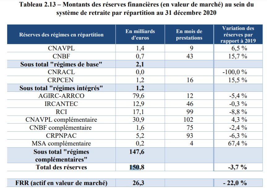 Selon le dernier rapport du Conseil d'orientation des retraites (COR), le montant total de ces réserves s'établissait, au 31 décembre 2020, à 150,8 milliards d'euros, dont plus de la moitié (79,6 milliards) provient de l'Agirc-Arrco qui gère les cotisations des cadres, salariés et de leurs entreprises. L'an dernier, ce pécule a été grignoté de près de 4% par l'épidémie qui a tari les montants des cotisations.