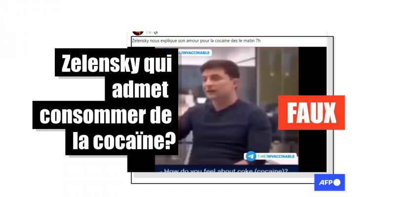 Sur Facebook (1, 2) et sur Twitter (3, 4, 5), une même vidéo partagée des centaines de fois depuis le 18 avril et également visionnée plus de 10.000 fois sur Telegram (6) depuis cette date montrerait, selon les internautes qui la relayent, le président ukrainien Volodymyr Zelensky reconnaître ouvertement lors d'une interview qu'il consomme régulièrement de la cocaïne.