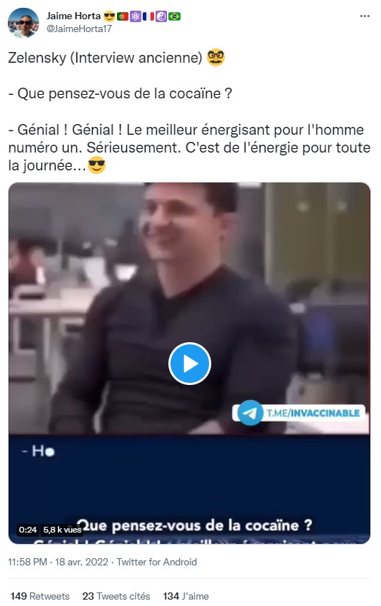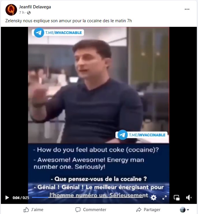 "Incroyable vidéo où Zelensky avouait être un junkie qui carbure à la cocaïne tous les matins. Selon lui, cela lui "donne de l'énergie pour toute la journée"", "Zelensky le cocaïnomane revendique fièrement se taper des rails de cocaïne", "Zelensky nous explique son amour pour la cocaïne dès le matin [à] 7h"...