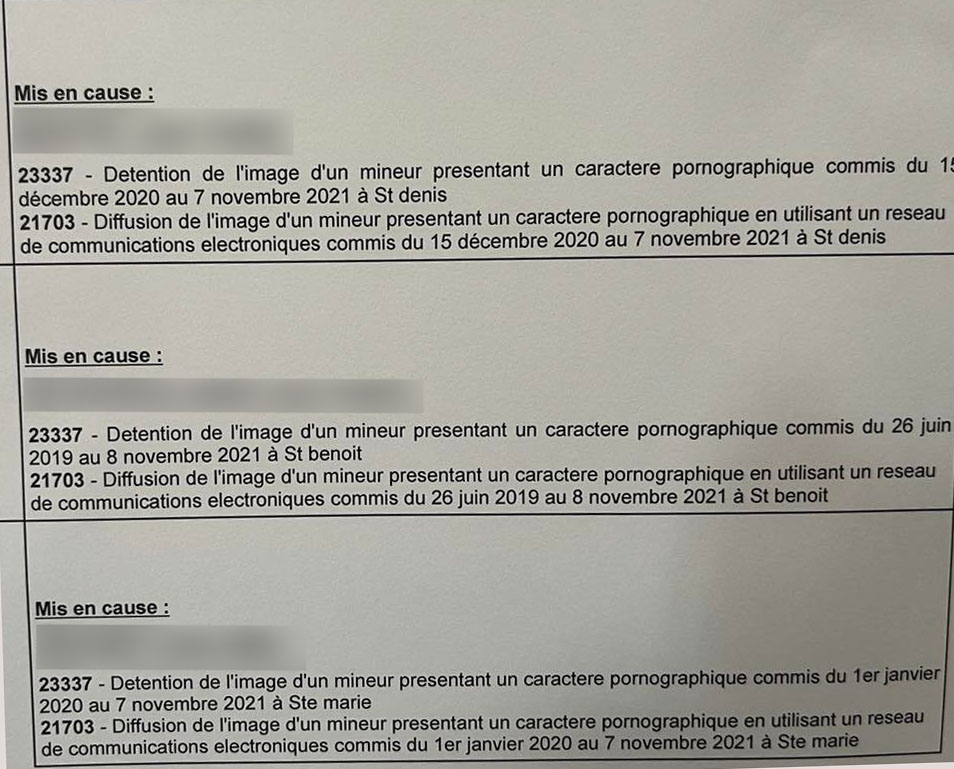 Huit personnes devaient passer en comparution immédiate à Saint-Pierre, sept sont actuellement en procès. Pour le dernier, il manquait l'expertise psychiatrique, il sera donc convoqué en décembre. "Le profil des suspects est varié, ils ont entre 21 et 53 ans, et nous avons trouvé jusqu'à 4.000 fichiers téléchargés. Chez certains les images n'étaient pas téléchargées, chez d'autres il y avait entre 45 et 4.000 fichiers. Beaucoup ont admis avoir une addiction lors de leurs auditions, certains ont dit être soulagés d'avoir été arrêtés. Seul un des suspects a réfuté les accusations" détaille Caroline Calbo, procureure de Saint-Pierre. "Je salue le travail des forces de l'ordre, qui ont réussi à préparer tous les dossiers en 48 heures".