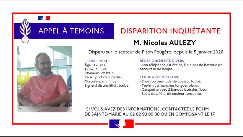 Dans un communiqué, les proches de Nicolas Aulezy expliquent cette démarche : "Votre expertise et votre engagement sont précieux pour retrouver Nicolas au plus vite. Une récompense sera offerte à la ou aux personnes qui permettront de localiser Nicolas Aulezy. Pour toute information complémentaire ou pour signaler un indice, merci de nous contacter via la page Facebook : Recherches Nicolas Aulezy – La Réunion."