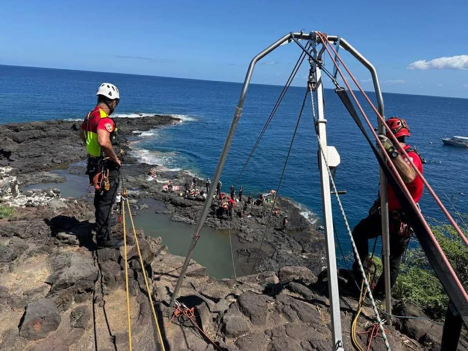 Ce vendredi 2 janvier 2026, les équipes du Groupe de reconnaissance et d'intervention en milieu périlleux (GRIMP) de La Réunion ont procédé au sauvetage d'une jeune femme, blessée après avoir sauté dans l'eau à 6 mètres de haut au niveau du Cap Lahoussaye. Suite à l’impact, la personne a nécessité une évacuation (Photo : Sdis 974)