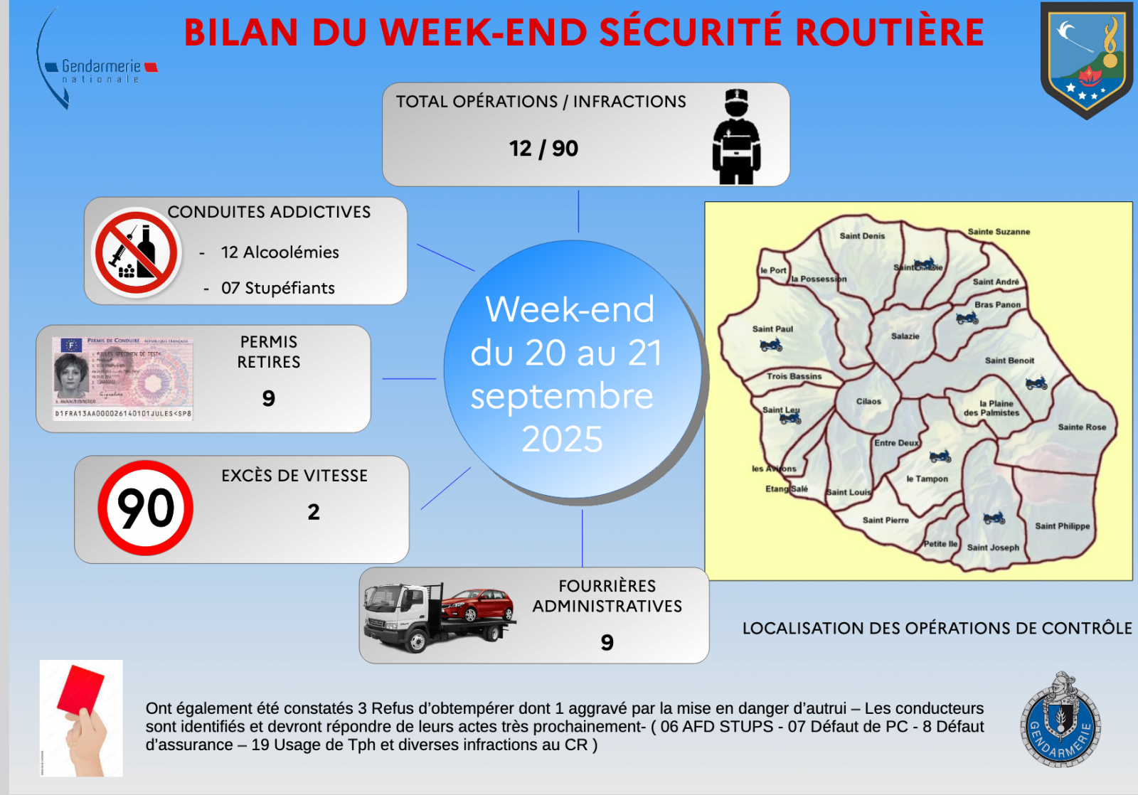 Les effectifs de la direction territoriale de Police nationale de La Réunion ont réalisé sur le département 31 opérations de sécurisation et de sécurité routière au cours de ce week-end du 19 au 21 septembre 2025, permettant de relever 289 infractions dont 34 délits. Secteur gendarmerie, 90 infractions ont été relevées dont 12 alcoolémies et 7 conduites sous stupéfiants. 9 permis ont été retirés. Trois personnes ont également commis des refus d'obtempérer. Identifiés, les conducteurs devront répondre de leurs actes devant la justice (Photo : sly/www.imazpress.com)