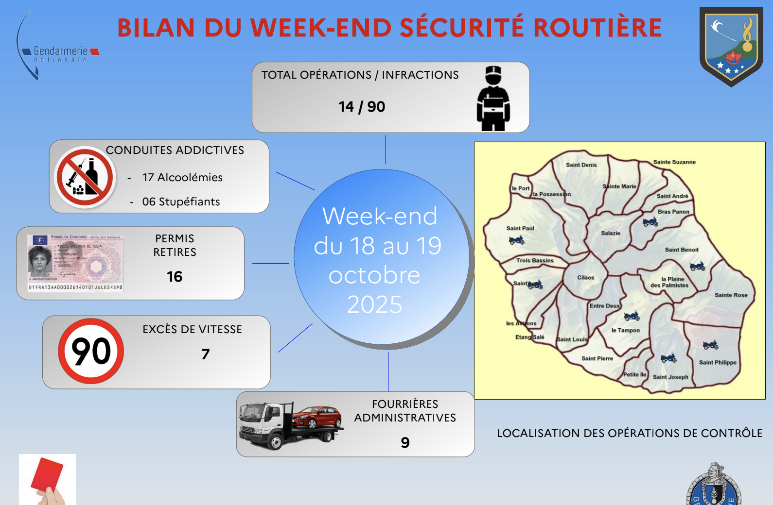 (Actualisé) Les effectifs de la direction territoriale de police nationale de La Réunion ont réalisé sur le département 28 opérations de sécurisation et de sécurité routière au cours de ce week-end du 14 au 16 novembre 2025, permettant de relever 342 infractions dont 32 délits. Côté gendarmerie, 90 infractions ont permis de relever 17 alcoolémies et 6 conduites sous stupéfiants. 16 permis ont été retirés (Photo : rb/www.imazpress.com)