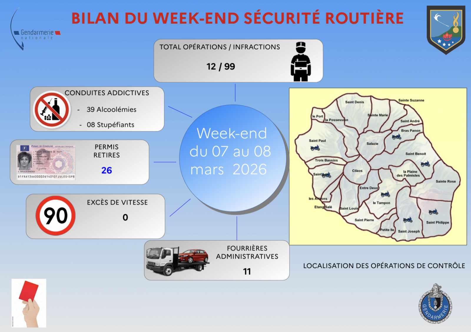 Ce week-end du 7 et 8 mars 2026, les forces de l'ordre étaient sur les routes. La gendarmerie de La Réunion a mené 12 opérations qui ont permis de relever 99 infractions dont 39 alcoolémies et 8 conduites sous stupéfiants. 26 permis ont été retirés. Côté Police, les effectifs ont réalisé sur le département 35 opérations de sécurisation et de sécurité routière au cours de ce week-end, permettant de relever 410 infractions dont 47 délits. (Photos Stephan Laï-Yu / www.imazpress.com)
