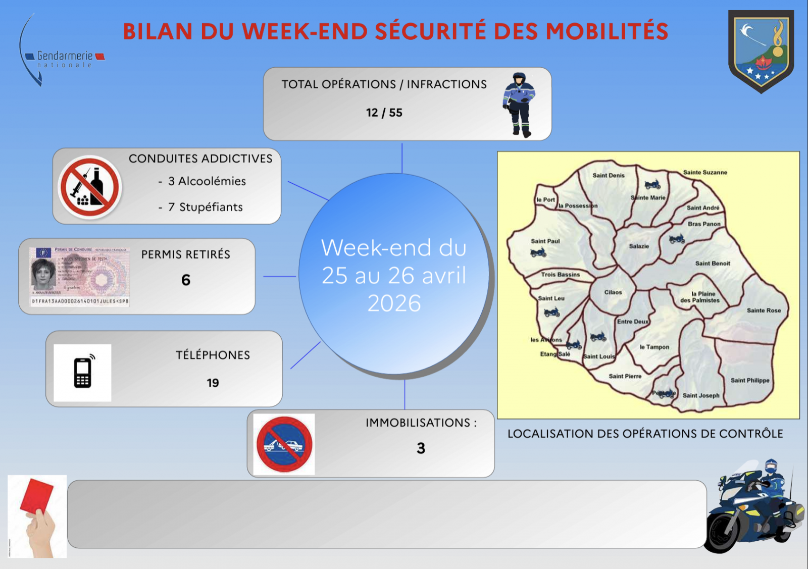 Ce week-end, du 25 au 26 avril 2026, les gendarmes de La Réunion ont relevé 55 infractions sur les routes réunionnaises dont 3 alcoolémies et 7 conduites sous stupéfiants. 6 permis ont été retirés et 3 véhicules immobilisés. (Photo Richard Bouhet / www.imazpress.com)