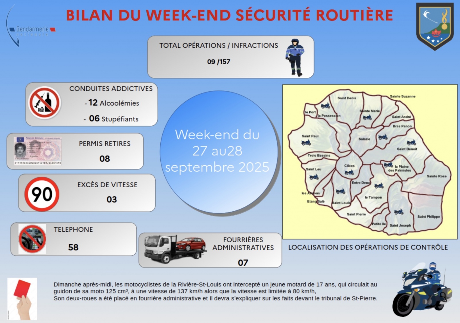 La gendarmerie a réalisé 9 opérations de contrôle, relevant 157 infractions ce week-end du 26 au 28 septembre 2025. Dimanche après-midi, ils ont par ailleurs intercepté un jeune motard de 17 ans à la Rivière-Saint-Louis, qui circulait à une vitesse de 137 km/h alors que la vitesse est limitée à 80 km/h. Son deux-roues a été placé en fourrière administrative et il devra s'expliquer sur les faits devant le tribunal de Saint-Pierre. La police, elle réalisé 25 opérations de sécurité routière et relevé 128 infractions dont 24 délits (Photo : rb/www.imazpress.com)