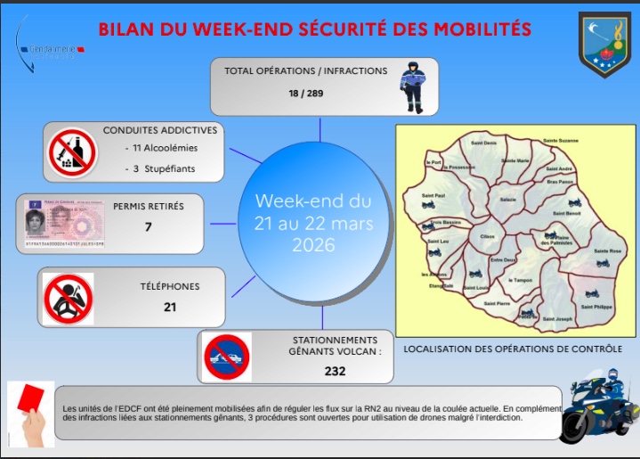 Les effectifs de la Direction Territoriale de Police Nationale de La Réunion ont réalisé sur le département 42 opérations de sécurisation et de sécurité routière au cours de ce week-end du 20 au 22 mars 2026 permettant de relever 604 infractions dont 38 délits :