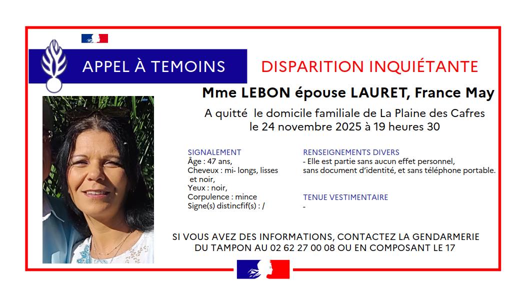 La gendarmerie du Tampon lance un appel à témoins après la disparition jugée inquiétante de France May Lebon, épouse Lauret, 47 ans. La quadragénaire a quitté à pied son domicile de La Plaine des Cafres, ce lundi 24 novembre 2025 vers 19 heures 30, sans effets personnels, sans papiers d’identité ni téléphone portable. Depuis, elle n’a pas donné signe de vie. (Photo rb/www.imazpress.com)