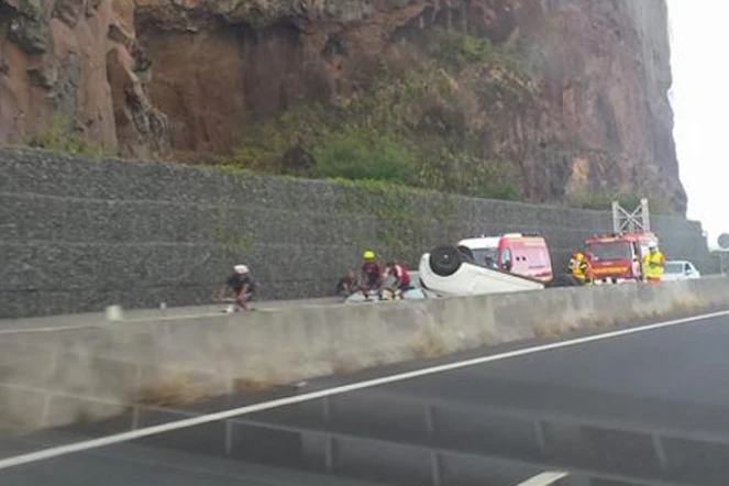 Aux alentours de 8h00 ce dimanche 27 août 2017, un véhicule circulant dans le sens ouest-nord a fait plusieurs tonneaux avant de se retrouver sur le toit sur la route du littoral. Selon un automobiliste témoignant sur Free Dom, la conductrice serait sortie indemne de l'accident. (Photo : Stéphanie Cerveaux / Page Facebook Info Trafic 974)