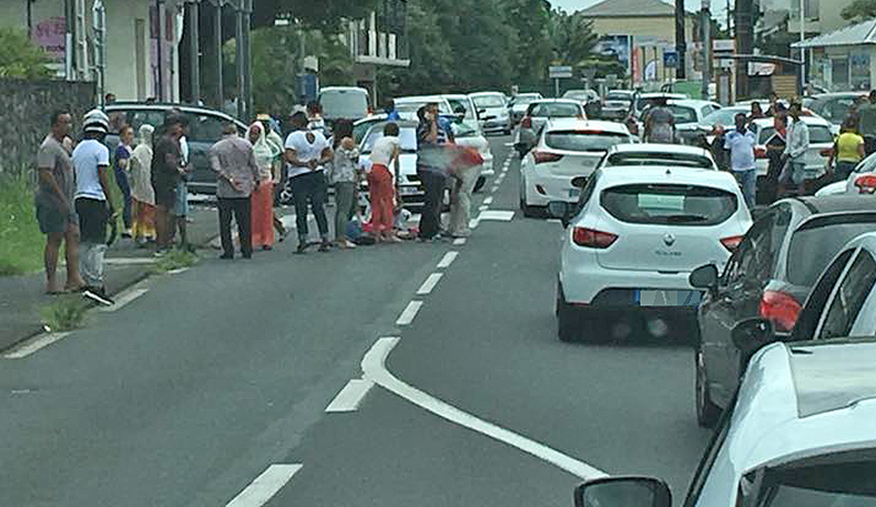 Une piétonne de 51 ansa été renversée par un deux-roues au niveau de la médiathèque de Saint-André ce mardi 3 avril 2018 vers 14h10. La piétonne serait gravement blessée. Les circonstances de cet accident ne sont pas encore déterminées. Les pompiers, le SMUR et les forces de l'ordre sont sur place sont sur place (Photo Laurent Ramsamy/Radar974/facebook)