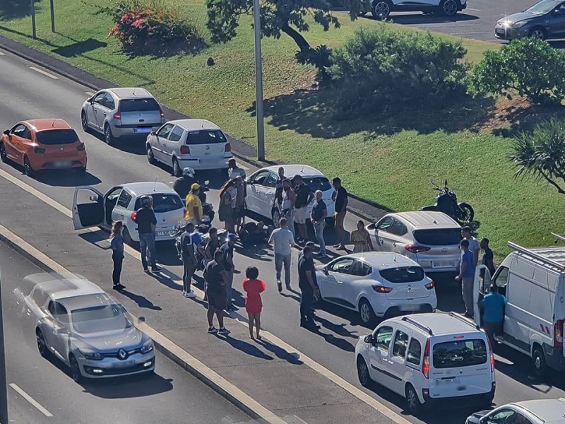 Un accident survenu sur le boulevard Lancastel, après le pont Pasteur en direction du Barachois, a entraîné un gros ralentissement de la circulation à Saint-Denis. Un motard était impliqué et la voie de droite a été neutralisée dans un premier temps. La circulation a été coupée, le temps de dégager la voie pour laisser les secours intervenir. A 17 heures, la circulation a été totalement rétablie. L'incident est terminé (Photo : Matt le sage / Radar 974)