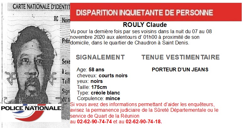 Une enquête est ouverte suite à une disparition à Saint-Denis, quartier du Chaudron. Claude Rouly, placé sous curatelle renforcée, est activement recherché. Âgé de 58 ans, l'homme est sous traitement médical. Il a été aperçu pour la dernière fois par ses voisins dans la nuit du 7 au 8 novembre 2020 à proximité de son domicile. Il portait un jean. De corpulence mince, il mesure 1m75, avec des cheveux courts noirs et des yeux également noirs. Si vous avez des informations, merci de contacter le 0262 90 74 74 ou le 0262 90 74 18. (Photo d'illustration rb/www.ipreunion.com)