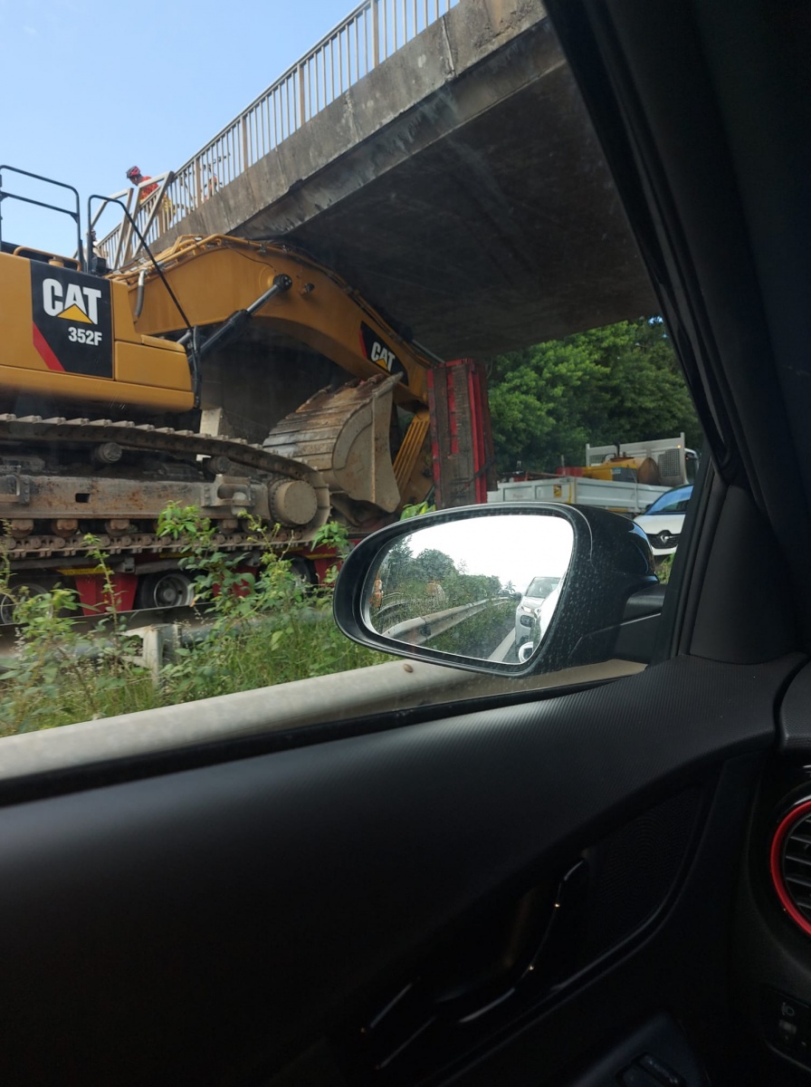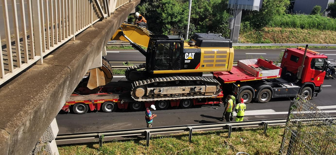 Accident spectaculaire ce mardi 23 mas 2021 sur la 4 voies de Sainte-Marie. Circulant en direction de Saint-Denis vers 13h15, un poids lourd transportant un caterpillar est resté coincé sous le pont des Cafés. L'ouvrage n'est pas en péril "et l'engin n'a pas été abîmé, il y a u juste un petit frottement" informe la direction régionale des routes. Pour éviter de plus gros dégâts, une délicate opération de désengagement a été lancée. A 18 heures passées le poids lourd a enfin été décoincé, il devrait être enlevé de la chaussée et les bouchons devraient se résorber. Il y a toujours 3 km d'embouteillages vers Saint-Denis et 10 dans l'autre sens (Photo Cinque Gé / Facebook Radar974)