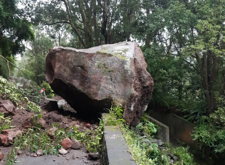 Les équipes du département, de la direction des routes et de la ville de la Salazie sont toujours sur le pont ce jeudi 22 avril 2021 pour dégager la route située au-dessus du lieu-dit Petit Sable à Salazie. Un bloc rocheux de 250 tonnes s'est décroché ce mercredi, il menace désormais de dévaler la pente. 12 personnes ont été évacuées et sont hébergées dans leurs familles. Le galet va être explosé et les autres blocs ainsi que les arbres menaçant de s'effondrer ont été enlevés. Le CRGT indique que les axes de circulation devraient être totalement rouverts d'ici ce vendredi matin (Photo : mairie de Salazie)