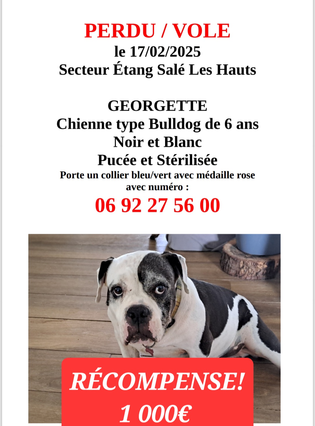 La propriétaire d'une chienne prénommée Georgette, de type Bulldog, pucée et stérilisée, tente depuis 18 jours de retrouver son animal. Selon sa maitresse, Georgette a disparu "dans des circonstances étranges à l'Étang-Salé les hauts le 17 février 2025". Une récompense de 1.000 euros est offerte pour la personne qui retrouvera la chienne de 6 ans qui porte un collier bleu/vert avec une médaille rose. (Photo : Gaëlle)