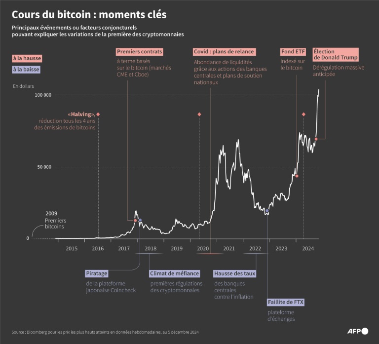 Elle a atteint dans la nuit un record de 103.800,45 dollars, après l'annonce mercredi par Donald Trump de son intention de placer un proche du secteur à la tête du gendarme américain des marchés financiers, la SEC.