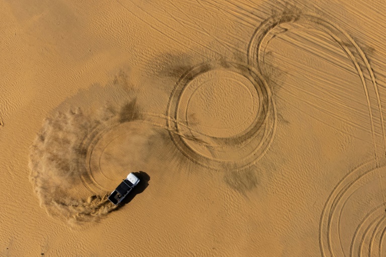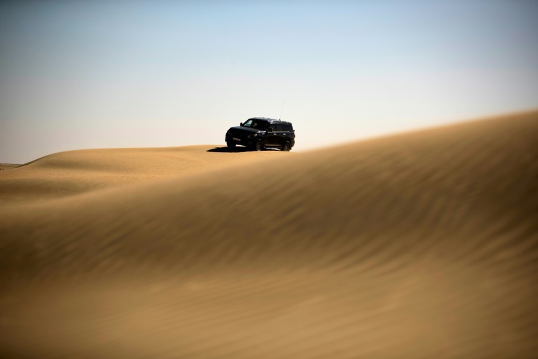 Enveloppée dans un nuage de sable, la caravane de véhicules tout-terrain slalome parmi les dunes s'étalant à perte de vue, chauffées par le soleil hivernal, sous le regard impassible de dromadaires gardés par leur pâtre.