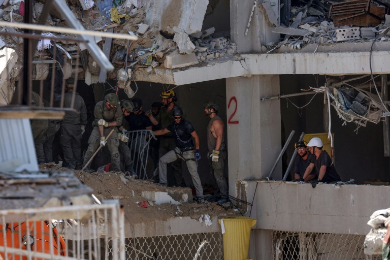 Au matin d'une nuit rythmée par les attaques aériennes iraniennes sur tout le pays, seuls les casques oranges des services de secours se détachent du gris des décombres, des amas sans début ni fin où s'entremêlent des parpaings, des tiges métalliques et des morceaux de fenêtres.