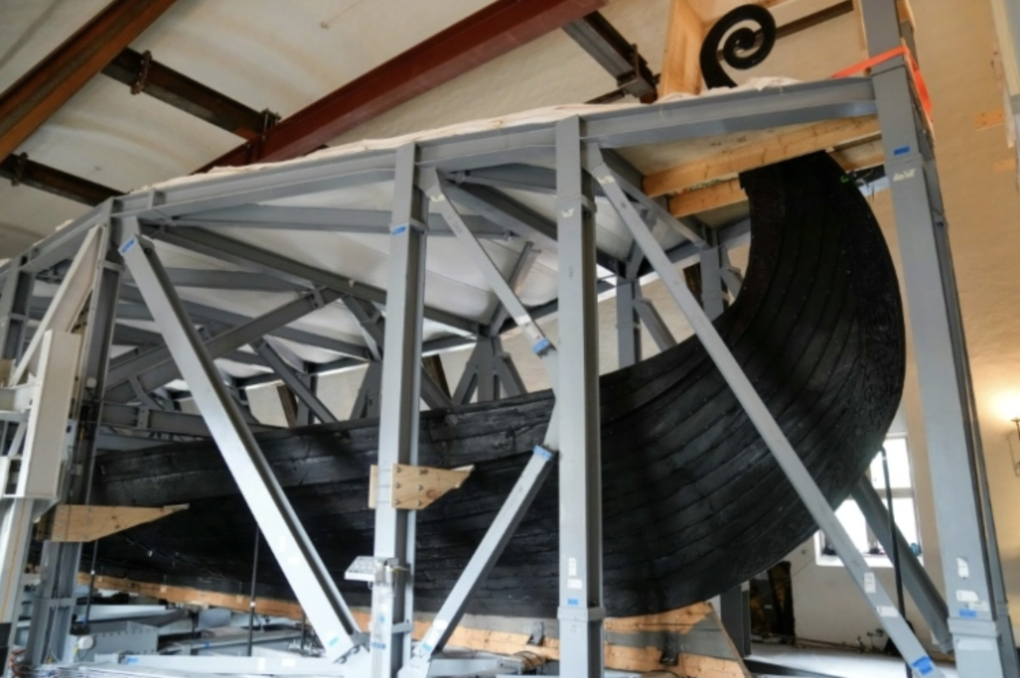 Aussi vieille que fragile, la vénérable coque en chêne, enserrée dans une lourde protection métallique, a voyagé, très lentement mais sûrement, suspendue à une grue se mouvant sur un rail fixé en hauteur.