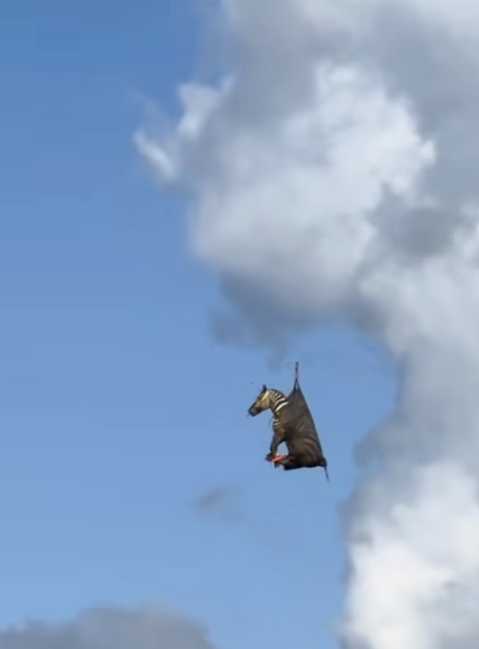 Un zèbre tracté par un hélicoptère dans le ciel. Cette image a été prise ce dimanche 8 juin 2025 dans le comté de Rutherford dans le Tennessee aux États-Unis.