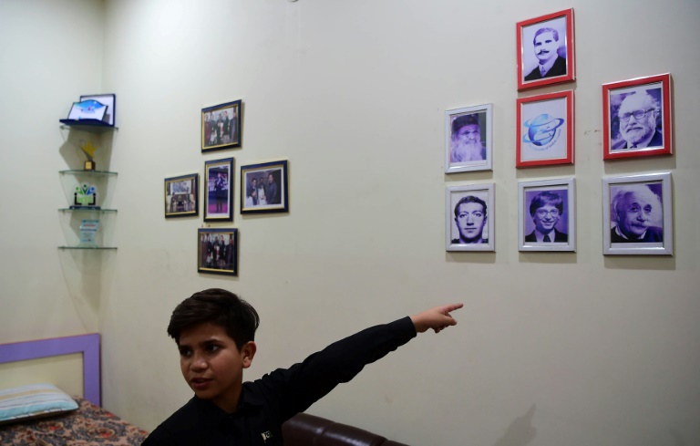 L'enfant étudie parfois "dix à douze heures d'affilée", selon ses mentors. Dans sa chambre austère, des photos le montrant en compagnie de l'ambassadeur de Chine à Islamabad et de l'homme politique Imran Khan surplombent son petit lit à une place. Les posters de héros de bande dessinée ou de sportifs sont absents, les jouets rares. "Batman et Superman sont de faux héros. Mais ceux-là sont vrais", affirme-t-il en désignant les portraits d'Allama Iqbal, Bill Gates ou encore Albert Einstein qui ornent ses murs.