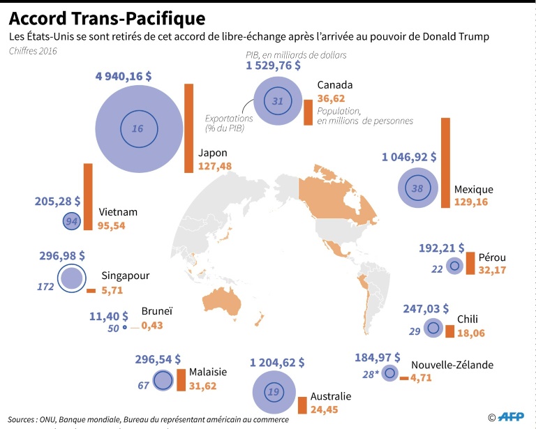 Mais avant son entrée en vigueur, le président américain Donald Trump a annoncé le retrait de son pays, mettant en péril l'ambitieux accord censé englober 40% du PIB mondial et presque 25% du commerce international.
