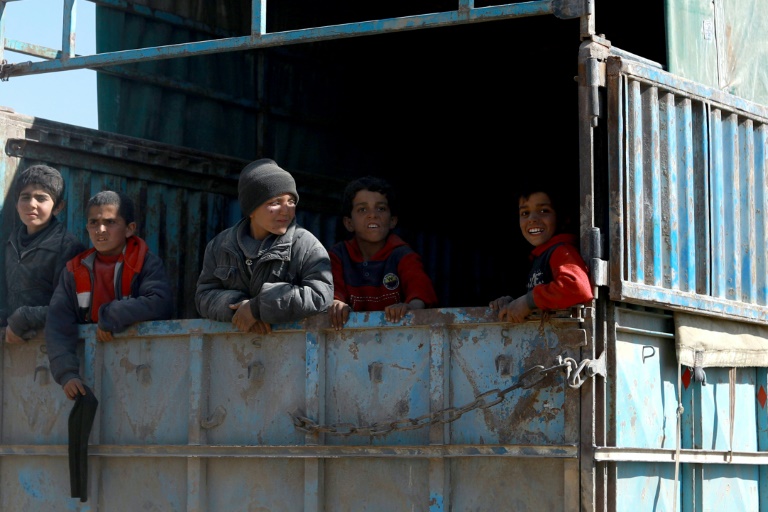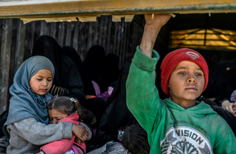 Sur une position des Forces démocratiques syriennes (FDS), près de Baghouz, une équipe de l'AFP a vu passer le convoi escorté par l'alliance arabo-kurde à sa sortie de ce village où l'EI est retranché dans une petite poche d'un demi-kilomètre carré. Après en avoir compté une trentaine, l'AFP a vu affluer environ dix camions de plus. A bord de ces véhicules, se trouvent des femmes en niqab noir, certaines transportant un sac à dos, qui se retiennent aux parois du camion. Il y a aussi des enfants aux vêtements sales et couverts de poussière qui dévorent parfois un bout de pain, et des hommes au visage masqué. Pas un mot, pas un cri, pas une plainte n'émane de ces camions.